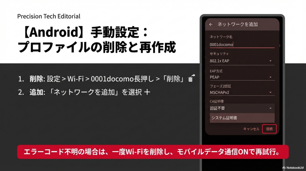 Android端末で0001docomoに接続できない場合、2025年4月に実施された認証設定の更新が未対応であることが最も多い原因です。