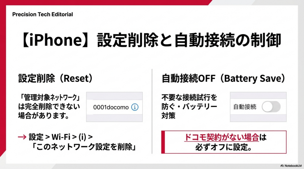 iPhoneの場合、設定 > Wi-Fi > 0001docomoの「i」から「自動接続」をオフにします。管理対象ネットワークの場合は「編集」から操作します。Androidでは、Wi-Fi設定から0001docomoの詳細で自動接続をオフにしてください。