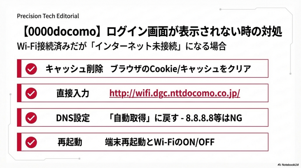 🔧 DNS設定の最適化: 端末のDNS設定を**Google DNS(8.8.8.8)やCloudflare DNS(1.1.1.1)**に変更すると、名前解決の速度が改善し、ログインページの表示が速くなる場合があります。ただし、0000docomoのログイン画面が表示されない場合はDNSを「自動取得」に戻してください。