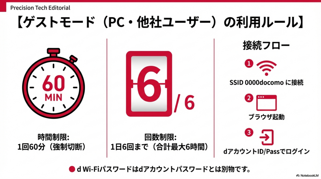 一方、ドコモ回線なしのユーザーは0001docomoへのアクセス権が廃止され、新設された**「d Wi-Fiゲストモード」(0000docomo)のみの利用となりました。ゲストモードには1回あたり最大60分、1日あたり最大6回**の利用制限があります。