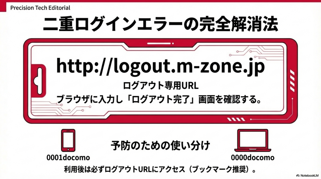 利用後は毎回 http://logout.m-zone.jp でログアウトすることを習慣にしてください。これだけで二重ログインエラーの大半を予防できます。