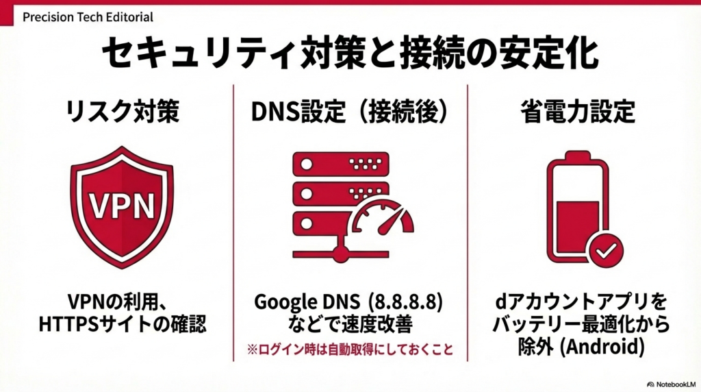 d Wi-Fiは0001docomoでのIEEE802.1X認証やTLS通信によりセキュリティが確保されていますが、公衆Wi-Fi特有のリスクは残ります。