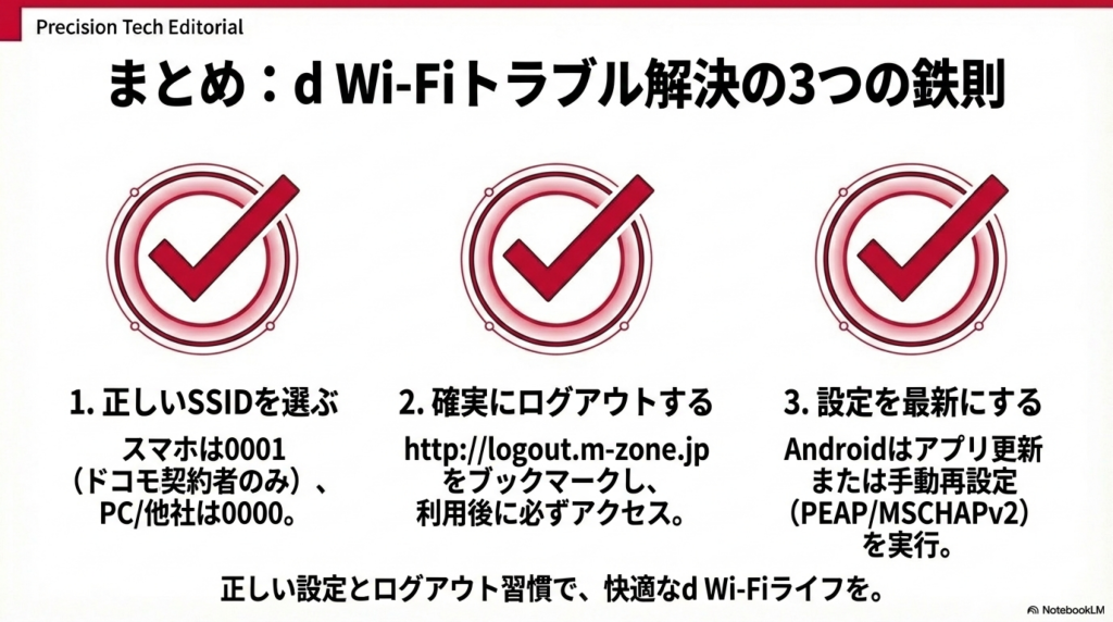 d Wi-Fiの接続トラブルは、SSIDの選択、ログアウトの実行、Wi-Fiプロファイルの再設定の3つを押さえることで大半が解決します。