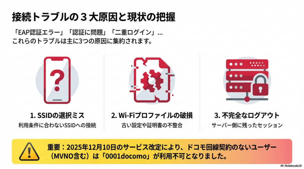 実はこの問題、2025年12月のサービス改定で利用条件が大きく変わったことを知らないまま接続しているケースが急増しています。ドコモ回線契約のないユーザーやMVNO利用者は、そもそも0001docomoに接続する資格自体が廃止されており、何度設定し直してもエラーは解消しません。