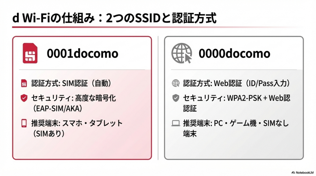 d Wi-Fiには2種類のSSID(ネットワーク名)があり、それぞれ認証方式とセキュリティレベルが異なります。