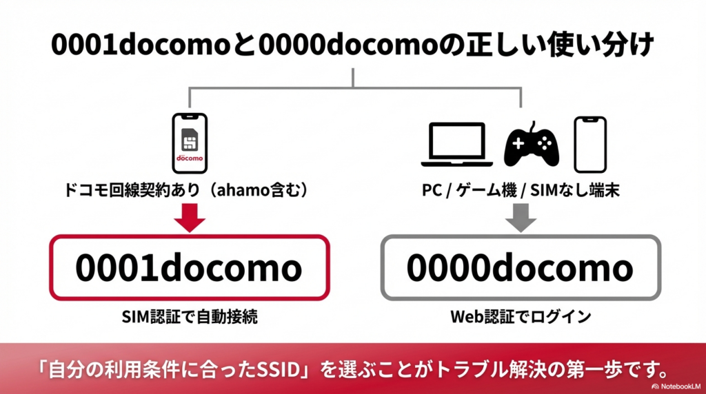 0001docomoはSIM認証による自動接続(ドコモ回線契約者向け)、0000docomoはWeb認証による都度ログイン方式です。複数デバイスで使う場合はスマホを0001docomo、PCを0000docomoにすると二重ログインを防げます。