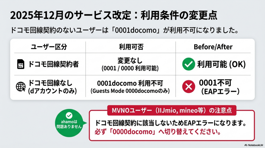 特に2025年12月の改定以降、ドコモ回線なしのユーザーやMVNOユーザーが0001docomoに接続しようとして認証エラーになるケースが急増しています。まず自分の回線契約を確認することが、原因特定の第一歩です。