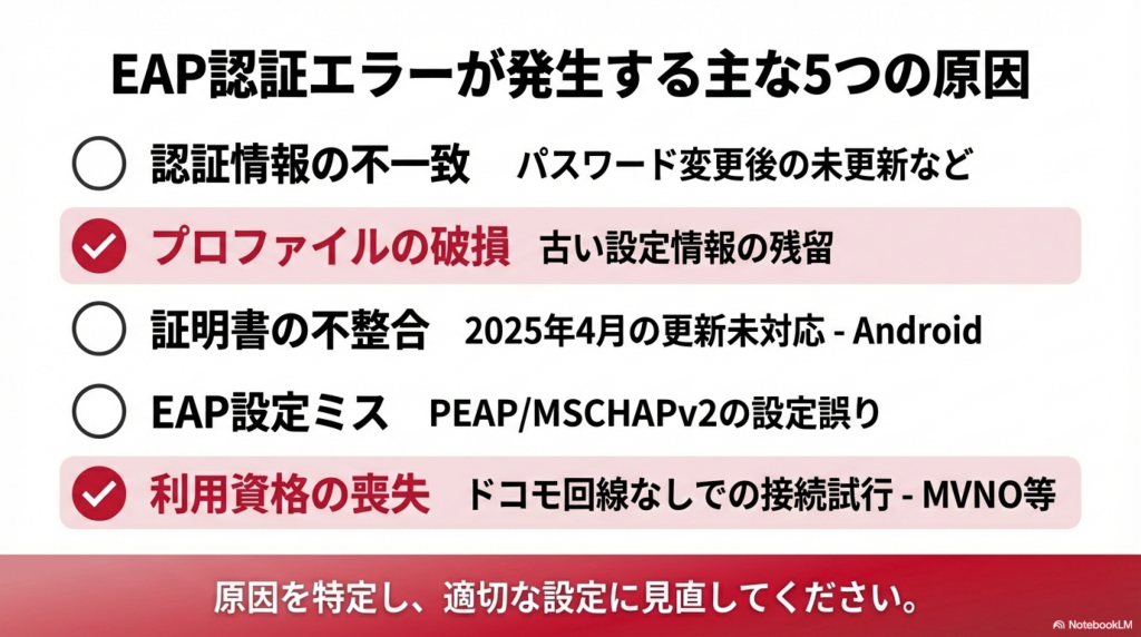 EAP認証エラーが起きる原因は、大きく5つに分類できます。