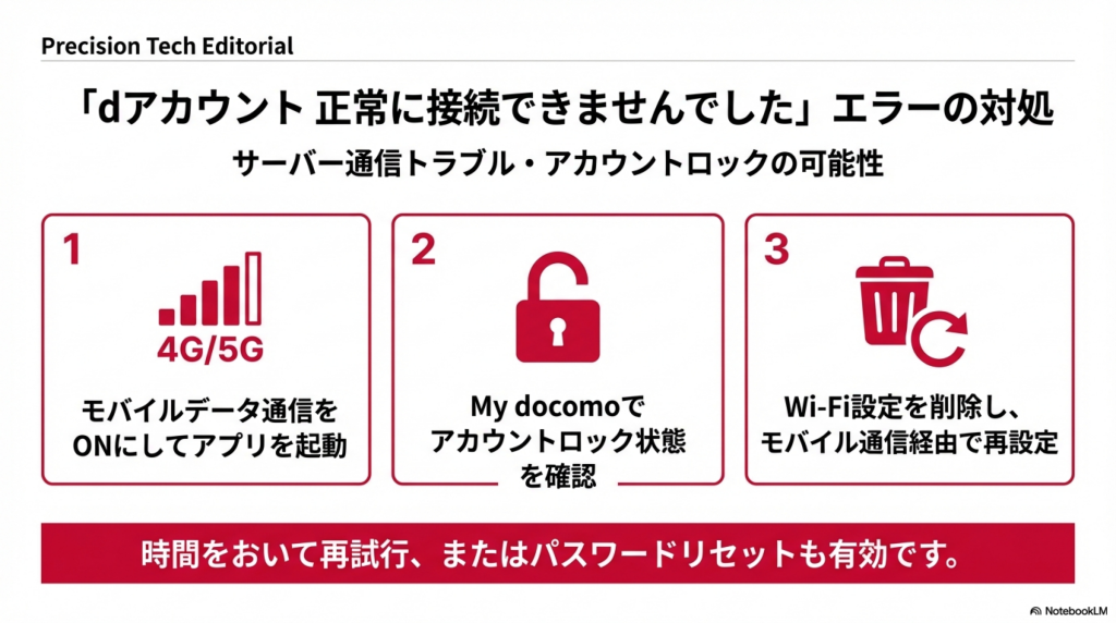 | 認証情報の不一致 | dアカウントIDやd Wi-Fiパスワードが誤っている、またはパスワード変更後にWi-Fi設定を更新していない |