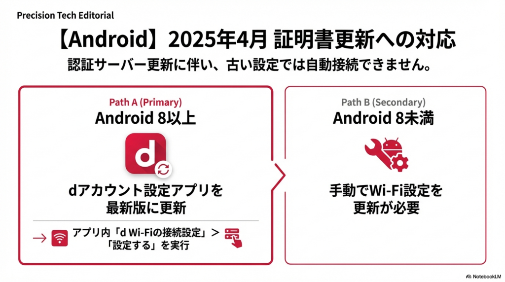 2025年4月、ドコモはAndroid端末のd Wi-Fi接続に使用される認証サーバーの証明書を更新しました。この更新に伴い、Android端末の接続設定(Wi-Fiプロファイル)の再設定が必要になりました。